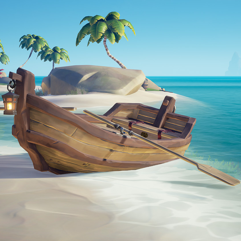 El boté está compuesto por dos asientos pero pueden navegar más piratas de pie sobre el bote, un cajón donde guardar recursos y un farol en la parte delantera que puede ser encendido o apagado.