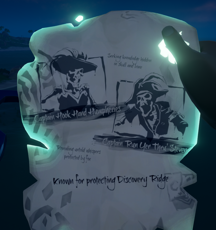 Each Bounty Map lists 1-4 Skeleton Captains or Skeleton Crews to be found at a specified Island location. Once at the island, players can find their bounties either by seeking a large group of Bounty Skeletons, indicated by their coloured clothing, or by following ominous music that will lead to the group's spawn point. All Skeletons part of this quest will spawn at this single location.