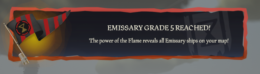 In order to be Graded as an Emissary, Player Crews first have to vote to become representing Emissaries for a Trading Company. This can be done at an Emissary Table (usually next to Trading Company Representatives) once players have purchased the Emissary Flag for the Company. Every Emissary Ship starts out at Grade I that rewards Players with only Emissary Value for each Company-specific Treasure item sold. Crews get Emissary Grade Reputation for completing tasks for the Companies, such as Voyages and Quests, defeating dangers on the Seas or Sinking rivalling Ships. Emissary Reputation is generally not gained for selling Treasure Items. Players can see their Emissary Grade progress from the Reputation Tab in the Pirate Menu or in the Equipment Radial Menu. Emissary Grades can be progressed up to Grade V, after which Crews gain access to special bonuses.