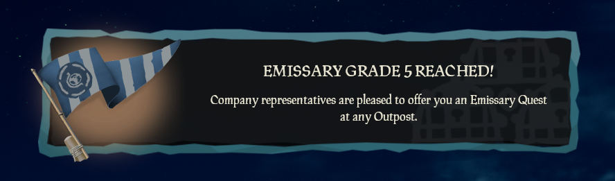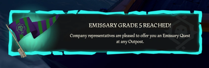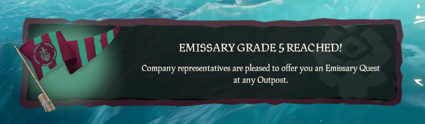 Emissary Grades constitute the Graded progression system of Trading Company Emissaries in Sea of Thieves. Each Emissary Trading Company has 5 Emissary Reputation Grades indicating a Ship and Crew's dedication to the Company's cause. Emissary Grades provide various benefits such as increasing Rewards, Reputation gains and Emissary Value and providing Crews with Emissary Quests. Emissary Grades are progressed through by completing tasks related to the given represented Trading Company.