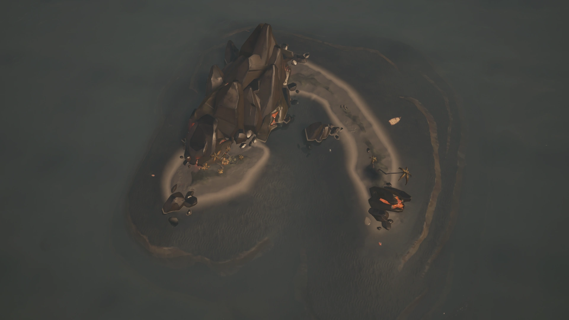 The island is mostly sand, with sparse vegetation and a rock formation to the east side. A small bay resides to the south side of the island.