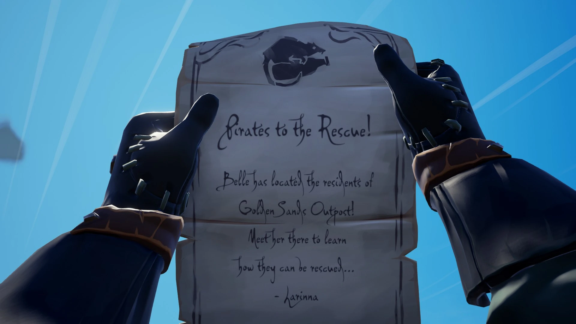 - Alternatively, you can sail directly to Golden Sands Outpost to meet Belle without talking to Larinna.