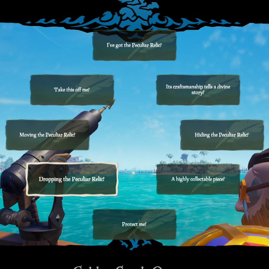 The Peculiar Relic is a type of Artefact in Sea of Thieves. Artefacts are trinkets made out of various precious metals and adorned with valuable jewels. As such they are coveted by the Gold Hoarders who are willing to buy them for Gold at any Outpost. Selling Artefacts also increases the Player's Reputation with the Company.