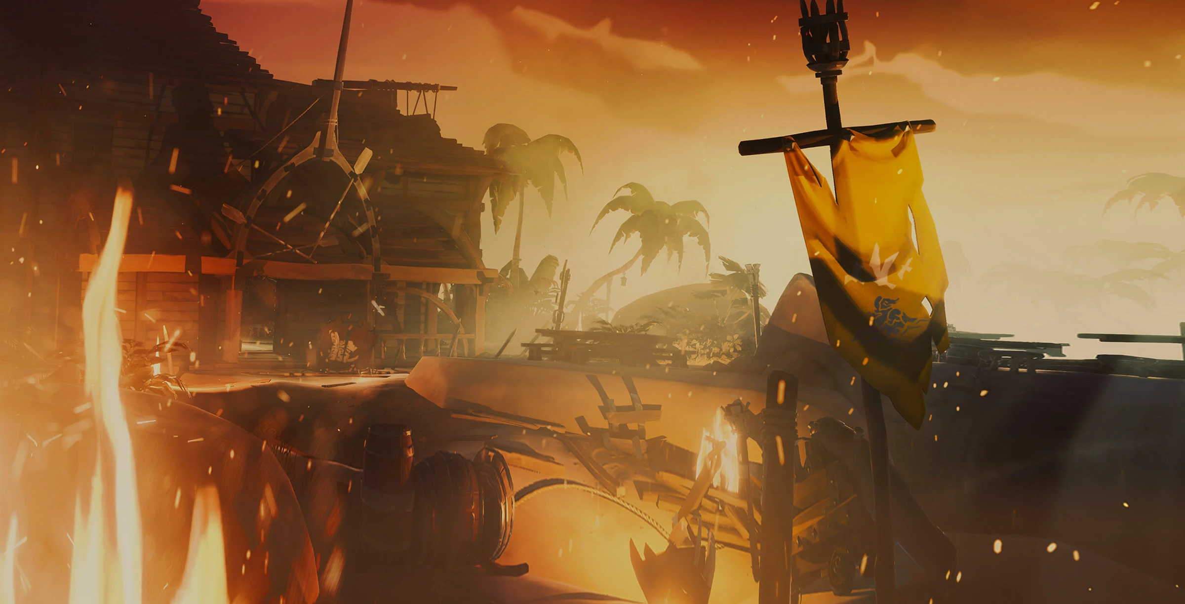Promotional image of Golden Sands Outpost being bathed in fire.